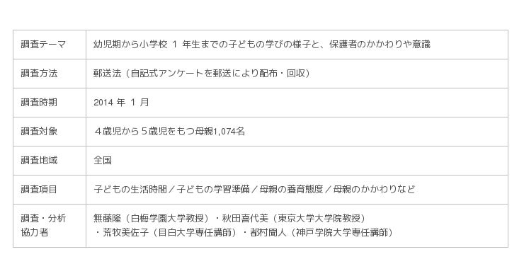 株式会社ベネッセホールディングス(本社:岡山市)の社内シンクタンク「ベネッセ教育総合研究所」では、子どもをもつ母親1,074名を対象に、2014年1月に「幼児期から小学1年生の家庭教育調査・縦断調査」を実施しました。この調査の目的は、3歳児期から小学1年生までの4年間、同一の子どもについて継続して、子どもの学びの様子や母親の意識をとらえることで、この時期に大切な子どもの育ちや保護者の関わりを明らかにすることにあります。こうしたテーマで大規模に行う縦断調査は他には少なく、貴重な知見が得られる調査といえます。