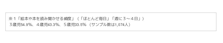 しかしその一方で、親子で深い対話によるやりとりができる「絵本や本の読み聞かせ」については、子どもが3歳から5歳にかけて、頻度が減少していく傾向も本調査から明らかになりました(※1)。絵本の読み聞かせには親子の絆を深めるとともに子どもの想像力を培うよさがあります。子どもが小学校低学年くらいまでは、親子で楽しくコミュニケーションするひとときとして、読み聞かせを楽しんでみるのはいかがでしょうか。