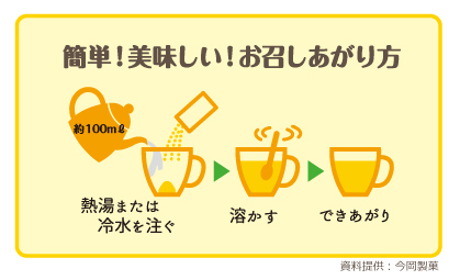さらさらのパウダータイプだから、冷水やお湯にすばやく溶けて簡単においしいレモネードの出来上がり!