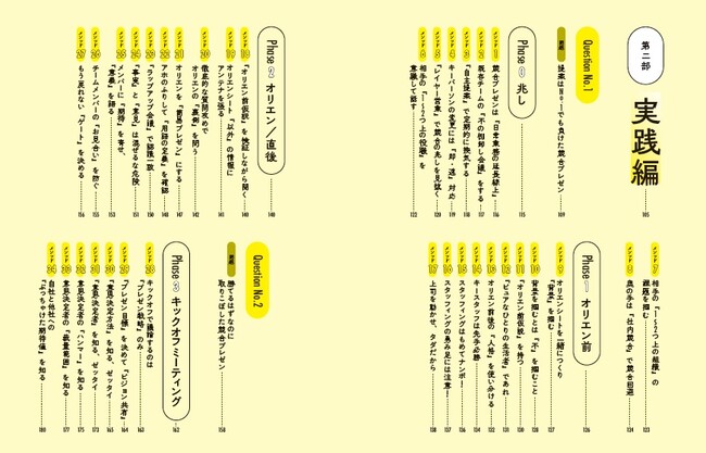 競合プレゼンに勝つポイントを、フェーズごとに100のメソッドにして紹介。巻末には、それらがどのようなスキルセットに該当するのかを整理した「メソッドリスト」を掲載しています。プレゼン常勝体質をつくるために、どんなスキルを鍛えると良いのかがわかります。