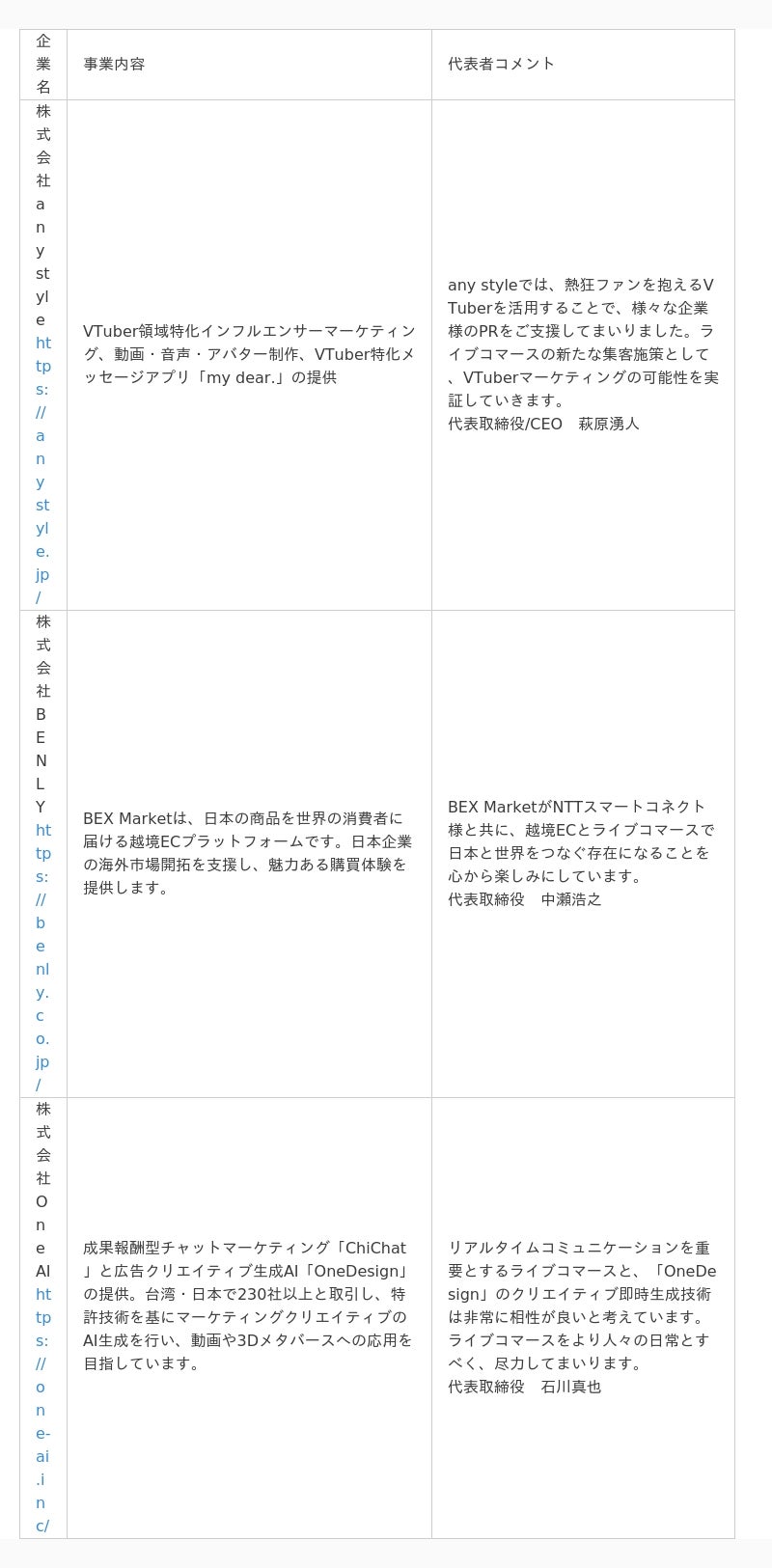 NTTスマートコネクトは、本日採択した共創パートナー3社と、ライブコマースプラットフォームを活用した共創に向けて詳細検討を行い、2024年度中に実証実験を予定しています。