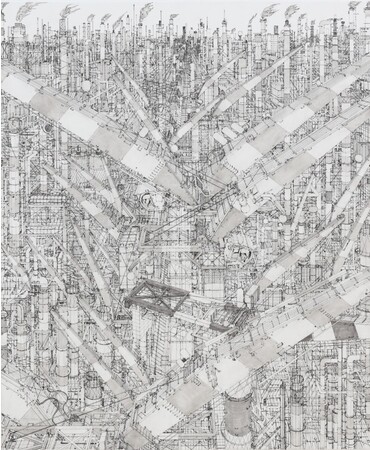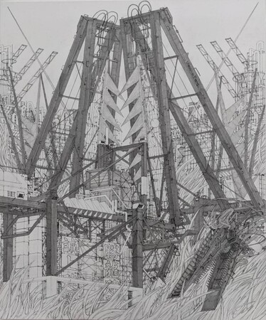 田島大介は1993年生まれ、奈良県出身のアーティストです。日本の大学で彫刻を学び、台湾へ留学したのち、台湾や香港などアジア圏を中心に活動を展開しています。浦沢直樹や大友克洋など、1990年代以降の日本の漫画やアニメーション、映画に影響を受けて磨かれていった自身のイマジネーションと、台湾や香港で実際に体験した風景の記憶を組み合わせ、超細密な線を駆使して架空の都市を描き出します。