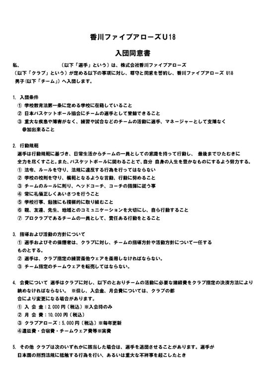 ▼香川ファイブアローズU18入団同意書