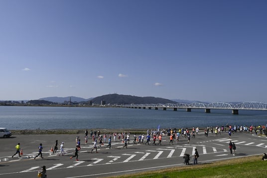 (写真)徳島を流れる大河「吉野川」をバックに力走するランナーたち。コースは吉野川に沿った堤防沿いを走り抜ける。