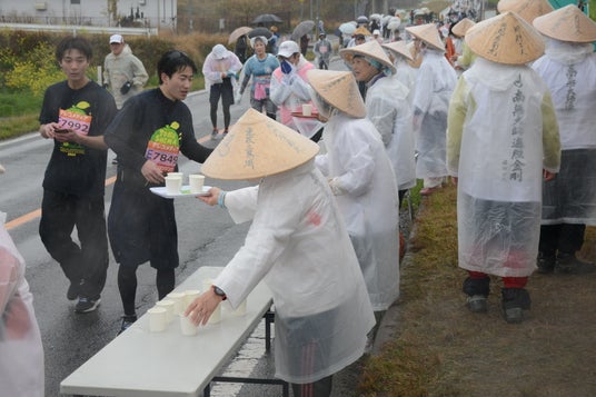 (写真)四国八十八か所でおなじみ「お遍路さん」の装いでランナーをお接待。こうした特徴的なエイドが沿道の至る所に。