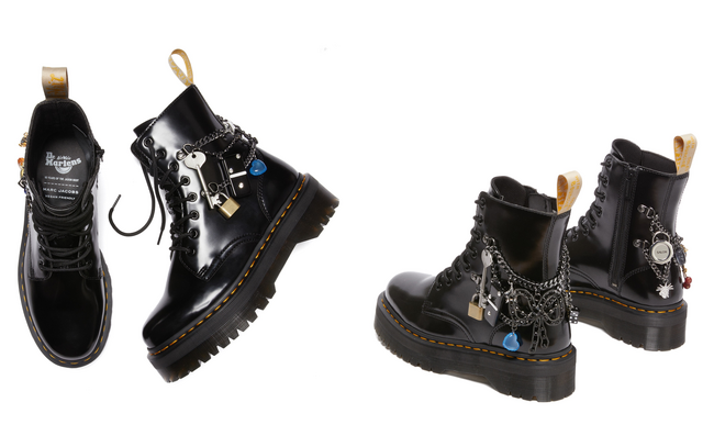 ヴィーガン素材の艶やかなアッパーにイエローウェルトステッチやヒールループなど、アイコニックなドクターマーチンのシグネチャーをあしらいながら、ブーツ本体にはシルバーチェーンを巻き込み、サイコロや南京錠、ハートや鍵など、遊び心溢れるデザインチャームを装飾し、マーク ジェイコブスらしいエッセンスをプラス。両ブランドのロゴが入ったタンや、スイングタグで仕上げました。カラーはブラック、サイズは36から41まで展開。