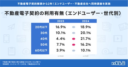 「電子契約を利用したデメリット」では、「届かなくて不安」との回答が2023年の43.6%から21.3%に、「見づらかった」との回答が2023年の41.4%から27.5%と大きく減りました。エンドユーザーのリテラシー向上とともに、電子契約システムの改善も理由の一つと考えられます。また、電子契約を利用した売買契約では「印紙税数万円が節約できる」というエンドユーザーのメリットも、売買領域での普及・中高年齢層の利用率向上につながった可能性があります。