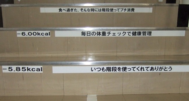 ・階段の利用を促進するために、工場内の階段に消費カロリーと「いつも階段を使ってくれてありがとう」などのメッセージを表示。