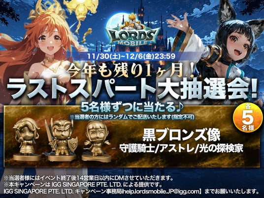 スマートフォン向けゲームアプリのグローバルメーカーIGG(会長兼CEO: Zongjian Cai 香港証券取引所上場 日本所在地:東京都新宿区)は、世界同時対戦RPG『ロードモバイル』において、『今年も残り1ヶ月!ラストスパート大抽選会!!』を開催いたします。