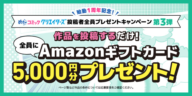 「めちゃコミック クリエイターズ」ではサービス始動1周年を記念し、応募条件を満たした作品投稿者全員にAmazonギフトカード5,000円分を贈呈するキャンペーンを実施します。ぜひ奮ってご参加ください。