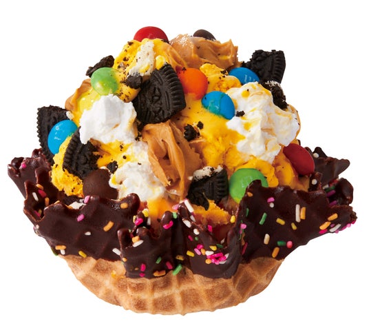 お菓子をくれなきゃいたずらしちゃうぞ!!とハロウィンをイメージし、エムアンドエムズ(R)やココアクッキーなどたくさんのお菓子がトッピングされた期間限定のアイスクリーム。パンプキンアイスクリームの甘さにピーナッツバターの塩味がアクセント!カップを、カラースプレー付のハッピーチョコワッフルボール(別売り)にするとさらにかわいい華やかなアイスクリームに仕上がります。