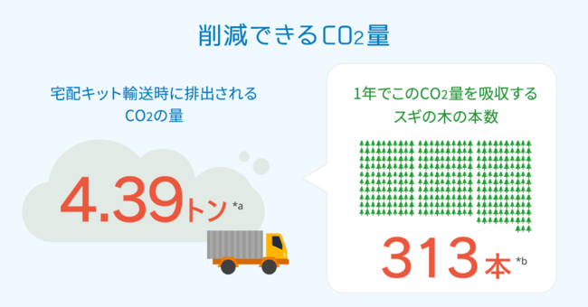 本キャンペーンによって宅配キットの配送に伴って排出される4.39トンのCO2が削減される試算になります(※4)。これは、1年間でこのCO2量を吸収する杉の木313本分に相当(※5)します。