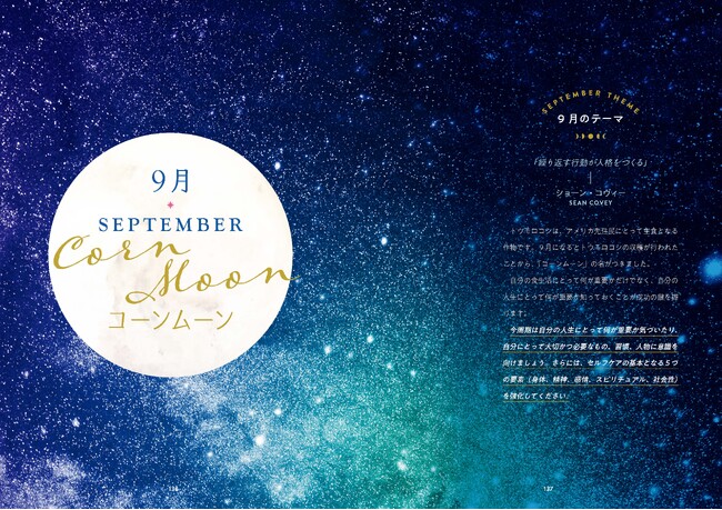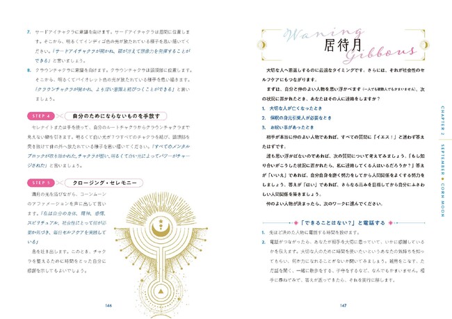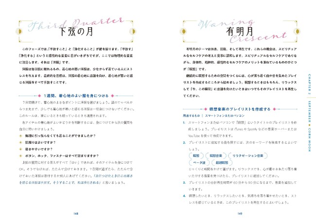 新月、三日月 、上弦の月、十三夜月、満月、居待月 、下弦の月 、有明月の8つのフェーズに沿った心と体と魂のセルフケアを紹介。