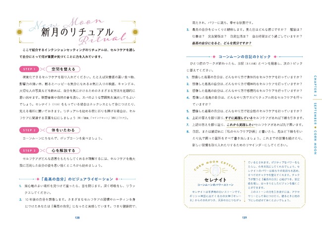 インテンションセッテイング(意図の設定)、ビジュアライゼーション、ジャーナリング、植物の世話、エクササイズ、パワーストーンの活用など、様々なセルフケア方法をガイド。