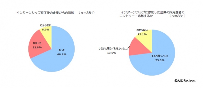 また、インターンシップに参加した企業の採用選考にエントリー・応募するか聞いた。「すると思う/した」学生が73.0%に上り、約4分の3が採用選考への参加に意欲を見せている。また、インターンシップ終了後に、参加企業から選考やイベントの案内があったかを聞くと、68.2%の学生が「あった」と回答した。