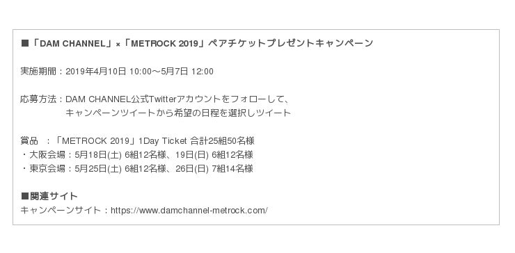 当キャンペーンは、DAMの最新情報をお届けするDAM CHANNELの公式Twitterアカウントをフォローして、キャンペーンツイートをツイートするだけで簡単に参加できます。抽選で「METROCK 2019」のチケットを合計25組50名様にプレゼントします。