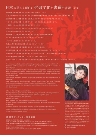 原愛梨は、文字と絵を組み合わせた“書道アート”という新しいジャンルを確立し、幅広い分野で活動するアーティスト。「世界に書道を広めたい。」という信念をもち、2022年4月にはニューヨークで書道パフォーマンスを披露しました。個展の開催は、2022年5月~6月以来二度目。今回の個展では、20点以上の新作が登場し、“神や妖怪などの日本文化“をコンセプトに、国内屈指の神社である神田明神から世界に向けて原愛梨作品を発信いたします。