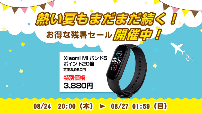 楽天市場「Show !t」は8月24日(木)20時から、シャオミのMiバンド5が通常価格3,980円(税込)のところ3,880円(税込)の特別価格で販売し、さらにご購入の方にポイント20倍プレゼントを実施します。また、8月24日(金)20:00~8月27日(金)01:59まで開催される、楽天お買い物マラソンに参加し、ポイント20倍プレゼント(一部商品を除く)を実施します。この機会にシャオミのスマートバンドMiバンド5でポイントをザクザク貯めましょう。