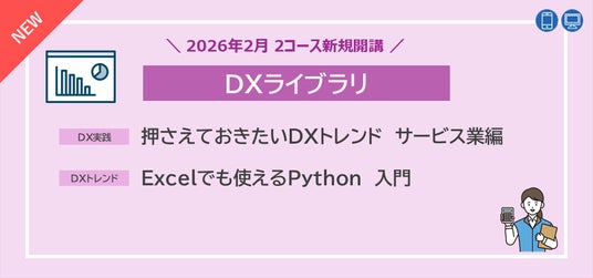 株式会社日本能率協会マネジメントセンター(代表取締役社長:張 士洛、東京都中央区、以下JMAM[ジェイマム])が展開する企業・個人向けの教育・研修メニューを提供する人材育成支援事業部は、オンラインで学べる法人向け教育ツール「eラーニングライブラリ(R)※1」において、2026年2月から新しく2コース『押さえておきたいDXトレンド サービス業編』『Excelでも使えるPython入門』を開講します。