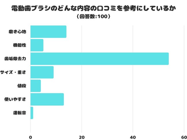 電動歯ブラシのどんな内容の口コミを参考にするかをアンケートにて調査したところ、1位は「歯垢除去力」でした。