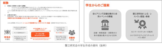 学生からは、飲食店側・消費者側の双方の意見・課題を整理した上で、サステナブルの定義が分かりにくく、知識も不足していることに加え、消費者として味や価格などサステナビリティより優先したいポイントがあるため、飲食店としてサステナブルな取組みを行う場合には、消費者の来店動機と結び付けることが重要と分析されました。そのうえで、飲食店、商業施設、消費者それぞれのサステナビリティ意識を高めるイベント開催や蟹江研究会によるサステナブルなレストランへの認証・表彰といった具体案の提案もなされました。