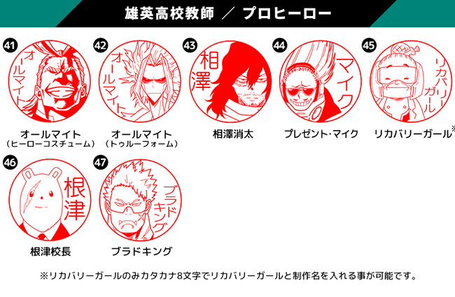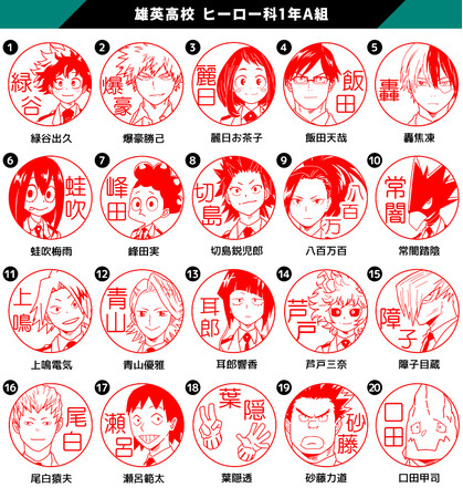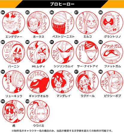緑谷出久や爆豪勝己、お茶子、死柄木弔などこれまでの72キャラに加えて、SNSからリクエストをいただいたプロヒーローなど34キャラがあらたに追加。ヒロアカ好きにはたまらない、実用OKのはんこです。