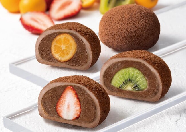 開発に関しては、「ベルギー産チョコレート」を使用し、果物の爽やかさに合うチョコレートクリームに仕上げました。クリームと果物の絶妙なバランスを完成させるために、チョコレートの分量を何度も調整し、ようやく完成したチョコレートクリームです。また、チョコレートクリームの魅力であるカカオの深い味わいがより感じられるように、ココアパウダーを餅部分に練り込み、さらに表面にもまぶすことで、濃厚なチョコレート大福に仕上げました。
