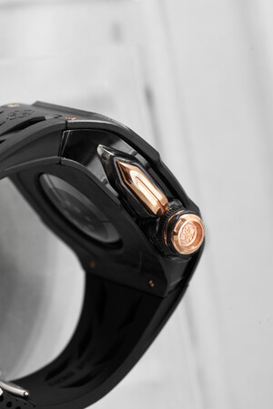 ブラックに映える、K18ローズゴールドに施されたデジタルクラウン等の各パーツのディテールの美しいアクセントが効いた外観は、申し分無しの仕上がり。