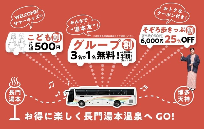 高速バスの往復乗車券と長門湯本温泉で使えるクーポンがセットになったお得な企画乗車券「そぞろ歩きっぷ(通常1名8,000円)」を、25%オフ・2,000円引きの”6,000円”で販売。