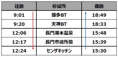 【運行経路】博多バスターミナル~西鉄天神高速バスターミナル~長門湯本温泉~長門市役所前~センザキッチン