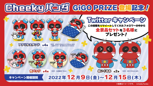 Twitterアカウント(https://twitter.com/GENDA_GiGO)をフォローの上で、該当のツイートをリツイートされたお客さまの中から抽選で3名様に「cheekyパンダ 全景品セット」をプレゼントいたします。