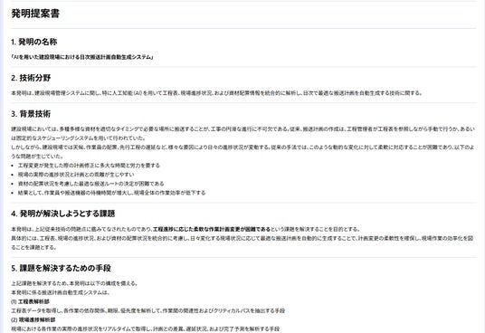 工程変更が頻発する現場課題に対し、発明要素の整理から発明提案書作成までをAIで支援