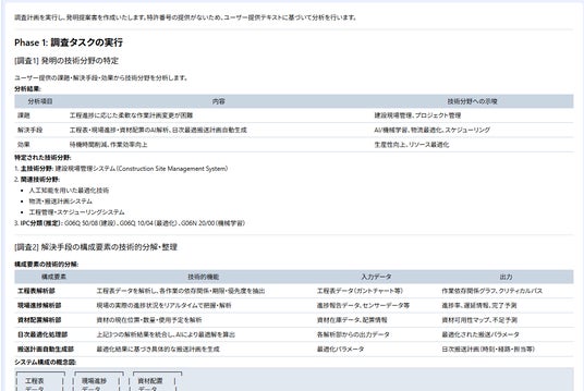 建設分野では、人手不足や工程の高度化を背景に、ロボットによる施工支援や資材搬送の重要性が高まっている。MyTokkyo.Aiを活用することで、こうした工程変動を前提とした制御・計画技術についても、発明要素の可視化と特許検討を効率的に進めることが可能となる。