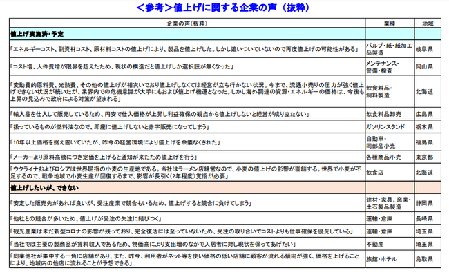 企業からは、「原材料、包材、段ボール、液体炭酸ガス、コーンなどの値上げにより、これまでの価格では利益を維持できなくなった」(飲食料品小売、石川県)など、原油・原材料価格の高騰により製商品を値上げせざるを得なくなったことを示す声があげられています。