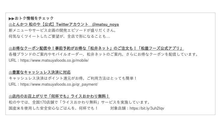 3月はささみかつマンスリー!皆様からの熱いご支持を受け、3月初めに復活を遂げた“しっとりやわらかささみかつ”。1週間後には、新作ソース「粒マスタードマヨネーズ」「ガーリックバター」を仲間に迎え“悪魔のささみかつ”が登場。そして今回は4ヶ月ぶり、ボリュームもお得感もマシマシの「お値段そのまま!ささみかつ増量フェア」を1週間限定で開催いたします。ささみかつファンの皆様へ日頃の感謝を込めて、ささみかつを1本プレゼント!松のや人気の“高タンパク低脂肪”の鶏ささみ肉をふっくら仕上げた「ささみかつ」でお腹も心も一杯に。対象商品は下記概要欄をご確認ください。
