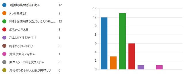 「とんかつ・エビフライ・牛肉の たまごたっぷりミックスとじ弁当」で最も多くの票を集めたのは『卵を2個使用することで、ふんわり仕上がっている』というポイントでした。以下2位は『3種類の具材が味わえる』、『ボリュームがある』でした。