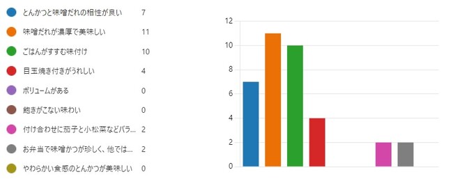 「しみうま濃厚 味噌かつ煮弁当」で最も多くの票を集めたのは『味噌だれが濃厚で美味しい』というポイントでした。以下2位は『ごはんがすすむ味付け』、『とんかつと味噌だれの相性が良い』でした。