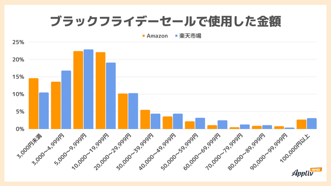3,000円未満ではAmazonが楽天市場より多い一方で、40,000円以上の金額帯では楽天市場がAmazonを上回る傾向にあります。楽天市場のブラックフライデーでは、買い物をしたショップ数に応じてポイント還元率が上がる「ショップ買いまわり」を実施していたため、使用金額の多い人が増えたのかもしれません。