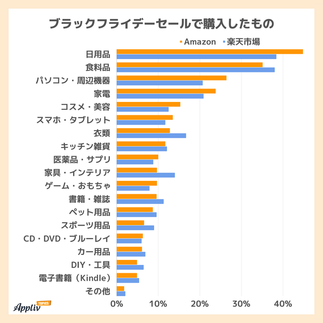 ブラックフライデーで購入したもので人気は「日用品」「食料品」「パソコン・周辺機器」「家電」。