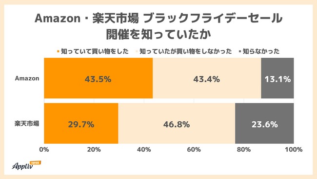 楽天では「知っていて買い物をした」が29.7%、「知っていたが買い物をしなかった」が46.8%で、開催の認知度は合計76.5%。ブラックフライデーで買い物をした人は、Amazonの方が13.8ポイント多い結果となりました。