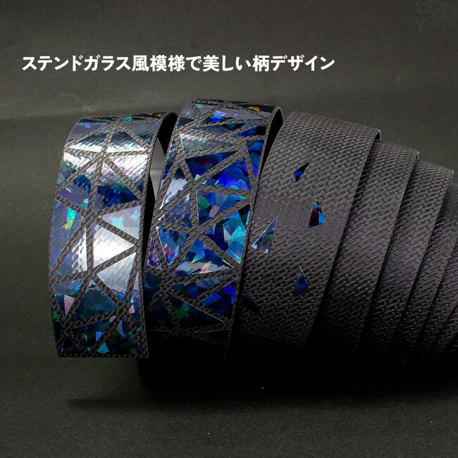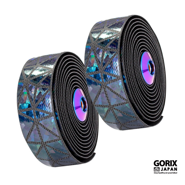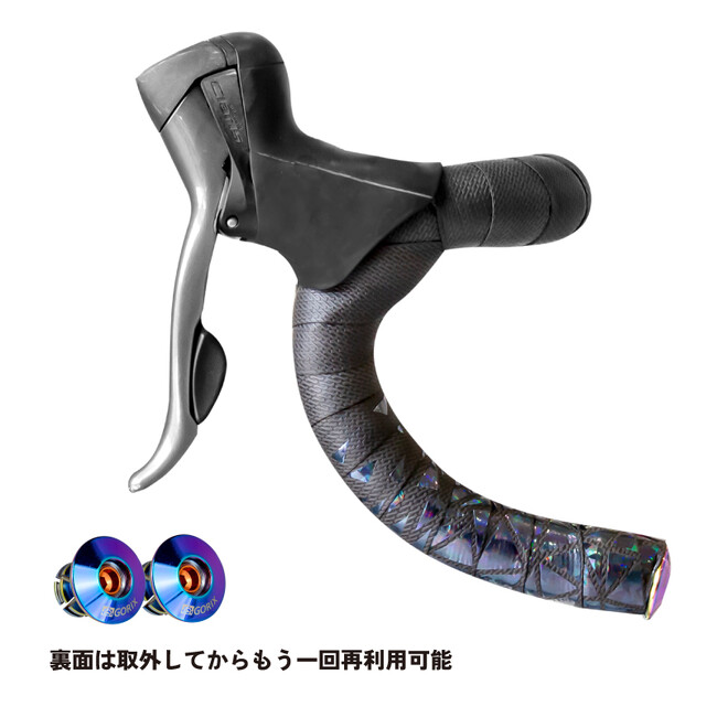 表面にはグリップ性が高いPUレザー+TPUに内側は衝撃吸収性に優れたEVA+ゴムの二重構造です。ブラックベースに先端はオイルスリック柄がちりばめられた、ステンドグラスのようなおしゃれなバーテープです。