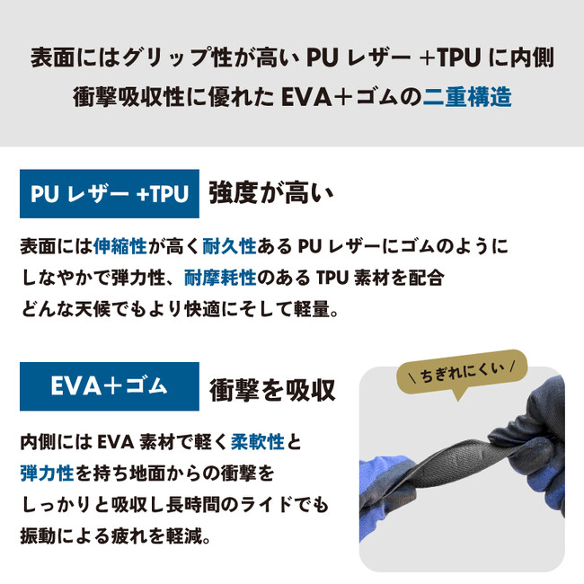 表面にはグリップ性が高いPUレザー+TPUに内側は衝撃吸収性に優れたEVA+ゴムの二重構造です。