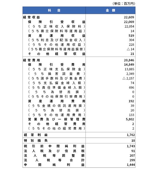 一方、保険引受費用が14,849百万円(対前年同期比13.7%増)、営業費及び一般管理費が5,802百万円(同7.4%増)、その他経常費用が2百万円(同129.2%増)となり、経常費用は20,846百万円(同11.5%増)となりました。