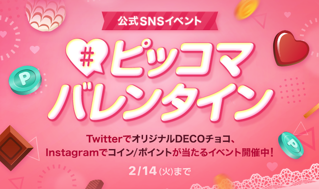 またピッコマ公式SNSアカウントではバレンタインイベント本日2/14(火)まで開催しております。SNSイベントはTwitterとInstagramで行われております。Twitterイベントでは、ピッコマ公式Twitterアカウントからバレンタインに関する投稿がされます。イベント参加条件として、まずピッコマ公式Twitterアカウントをフォロー、バレンタイン投稿をリツイートした後、コメント欄に答えを書き込んで頂いたユーザー様を対象に、抽選で14名様にピッコマオリジナルDECOチョコ10個入りセットをプレゼントいたします。Instagramイベントの参加方法は、まずピッコマ公式Instagramアカウント(piccoma_jp)をフォロー。投稿されたイベント投稿のコメントに好きなキャラのハート絵文字を投稿するだけです。ハート絵文字を投稿されたユーザーを対象にピッコマコイン/ポイントどちらかを1,000円分抽選で5名様にプレゼントいたします。