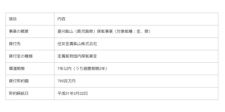 このたび、住友金属鉱山株式会社から金属鉱物国内探鉱資金貸付の申請を受け、これを審査した結果、JOGMECの目的とする「金属鉱物の安定的かつ低廉な供給に資する」と認められ、かつ、JOGMEC採択基準に合致していることから、下記のとおり採択いたしました。