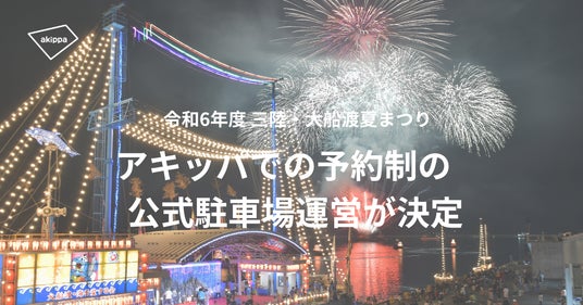 駐車場予約アプリ「アキッパ(akippa)」(以下、アキッパ)を運営するakippa株式会社(代表取締役社長 CEO:金谷元気)は、2024年8月3日に開催される「三陸・大船渡 夏まつり」において、公式駐車場を有料・事前予約制として販売するが決定いたしました。花火大会における公式駐車場への予約制導入を、アキッパが東北地方で行うのは初となります。