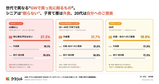 一方で、60代以上の層に「真っ先に削る予算」を聞いたところ、「特に削る予定はない」が27.2%と最多になりました(30~40代子育て層の「特に削る予定はない」13.9%の約2倍)。遠出は控えるものの、日々の食卓などにおいて極端な節約はせず、マイペースに自宅での連休を過ごすシニアならではの「堅実な巣ごもり」の様相が見て取れます。