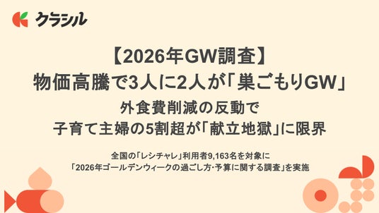 クラシル株式会社(本社:東京都港区、代表取締役社長:堀江 裕介、以下「クラシル」)が運営する節約アプリ「レシチャレ」は、全国の「レシチャレ」利用者9,163名を対象に「2026年ゴールデンウィークの過ごし方・予算に関する調査」を実施しました。