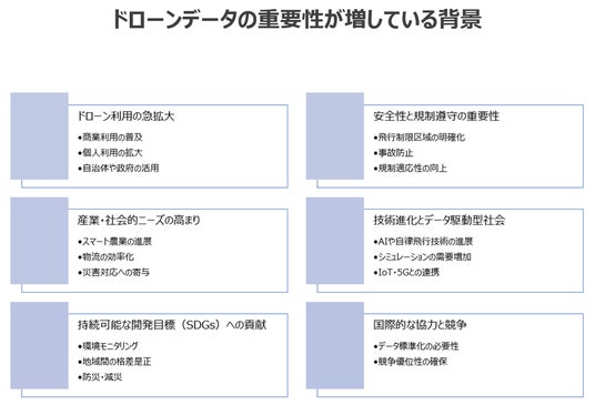 これらのオープンデータは、ドローンの効率的かつ安全な運用を支えるだけでなく、新しい市場や技術革新の基盤としても重要です。
