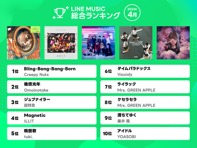 LINE MUSIC株式会社は、当社が運営する音楽ストリーミングサービス「LINE MUSIC」 (https://music.line.me/ ) の2024年4月の月間ランキングを発表、人気楽曲100曲を集めたプレイリストを公開します。さらに、「LINE MUSIC」独自のロジックで10代が今最も注目している楽曲を10代トレンドランキングとして発表します。
